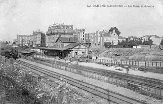 La compagnie des chemins de fer de l'Ouest, le , ouvre au service la gare de La Garenne-Bezons qui remplace, pour le service des voyageurs, la gare de Colombes-Embranchement. Elle est inaugurée le [7]. Sa desserte est effectuée uniquement par les trains de la ligne de Paris-Saint-Lazare à Saint-Germain-en-Laye qui marquent également l'arrêt pour la sécurité. Les trains de grandes lignes assurant la relation Paris – Le Havre ne la desservent pas[8]. La gare et son bâtiment voyageurs sont inaugurés le [9]. En 1893, la fonction de la gare évolue, la compagnie de l'Ouest ayant décidé qu'elle devient une « gare de transit pour les voyageurs entre la ligne de Saint-Germain et celle de Normandie ». Elle est donc ouverte à la desserte par les trains de grandes lignes pour éviter à nombre de voyageurs d'aller jusqu'à Paris pour revenir en banlieue ouest[10].