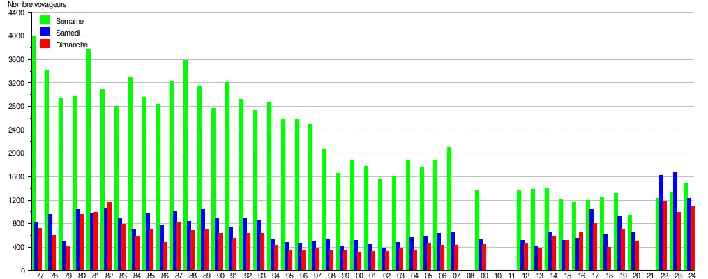 Ce graphique et tableau montre le nombre de voyageurs embarquant en moyenne durant la semaine, le samedi et le dimanche[5].