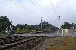 Les deux quais avec leur équipement pour l'éclairage encadrent toujours les deux voies électrifiées, à proximité du passage à niveau no 418 de la ligne.