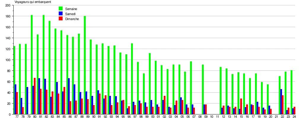 Le graphique et le tableau montrent le nombre de passagers qui en moyenne embarquent durant la semaine, le samedi et le dimanche[10].