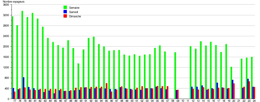 Ce graphique et tableau montre le nombre de voyageurs embarquant en moyenne durant la semaine, le samedi et le dimanche[7].