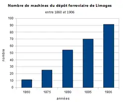 En 1885, le conseil municipal décide d'agrandir la gare saturée, victime de sa fréquentation. Un projet est adopté, et devant les vœux de la municipalité exprimés à la Compagnie, au ministère des Travaux publics et particulièrement au ministère de l'Industrie et du Commerce, face à la situation critique du fonctionnement de la gare elle-même ainsi que des entreprises du bâtiment, les travaux sont lancés fin 1888, quelques mois après la visite présidentielle de Sadi Carnot, natif de Limoges reçu à la gare[16], pour se terminer en 1891[a 7],[Note 2]. La gare est désormais dotée d'une élégante marquise[c 2] ».