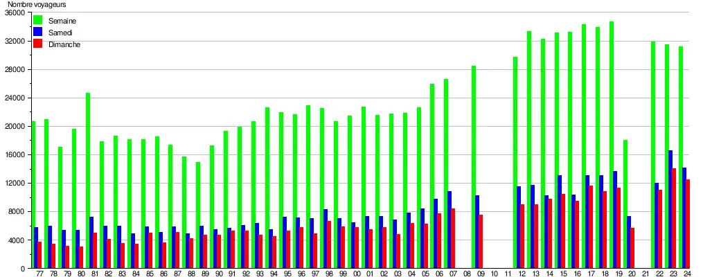 Ce graphique et tableau montre le nombre de voyageurs embarquant en moyenne durant la semaine, le samedi et le dimanche[23].