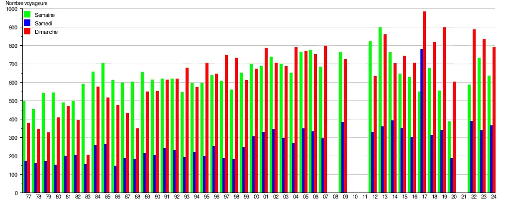 Ce graphique et tableau montre le nombre de voyageurs embarquant en moyenne durant la semaine, le samedi et le dimanche[9].