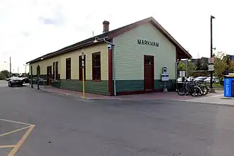 La gare de Markham a été construite par le Toronto & Nipissing Railway en 1869, alors que sa construction progressait vers le nord depuis Scarborough Junction[3]. Il s'agissait d'une structure rectangulaire en bois avec un toit en appentis pour abriter les passagers sur le quai, suivant un modèle similaire à celui des autres gares construites par le Toronto & Nipissing ailleurs à la même époque. Elle contenait une salle d'attente, une salle de bagages et le bureau de l'agent de la gare[4]. Le premier train est arrivé de Toronto le 1er juillet 1871, alors que la construction au nord d'Uxbridge était toujours en cours. Le service au-delà d'Uxbridge a commencé en octobre de la même année[3].