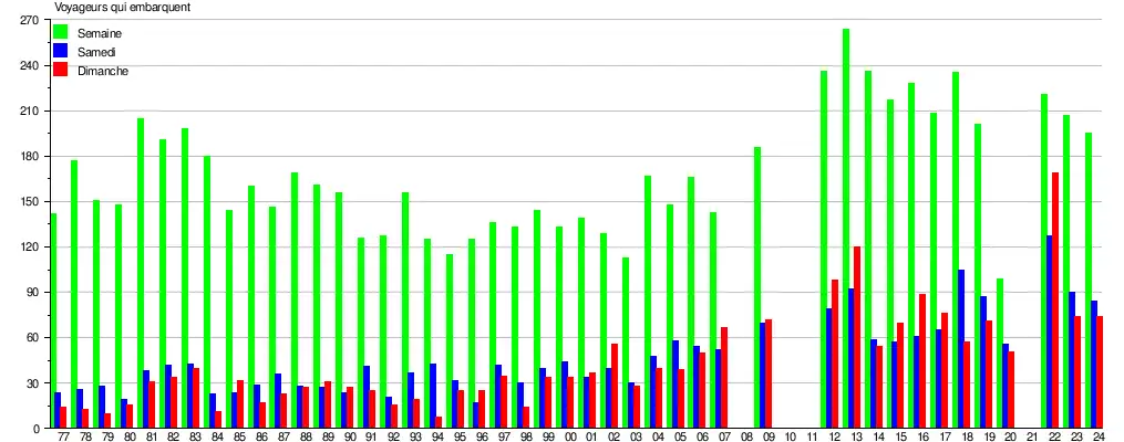 Le graphique et le tableau montrent le nombre de passagers qui en moyenne embarquent durant la semaine, le samedi et le dimanche[3].