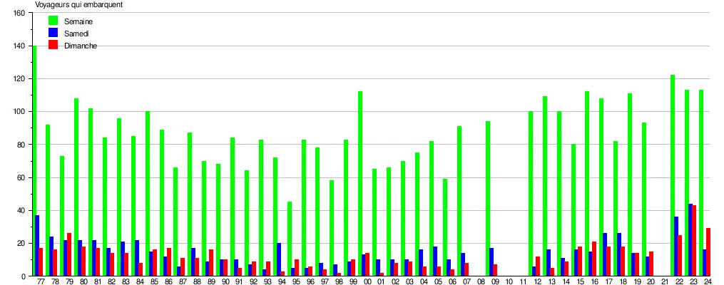 Le graphique et le tableau montrent le nombre de passagers qui en moyenne embarquent durant la semaine, le samedi et le dimanche[5].
