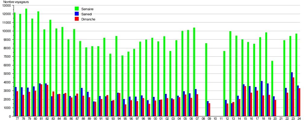 Ces graphique et tableau montrent le nombre de voyageurs embarquant en moyenne durant la semaine, le samedi et le dimanche[34].