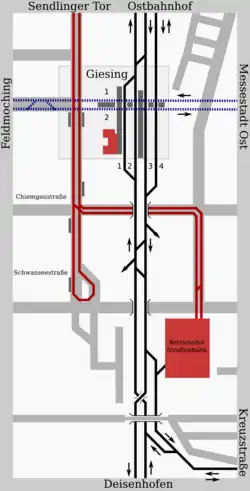 La gare de S-Bahn comporte quatre voies, dont une sans quai est utilisée pour le trafic de marchandises et deux pour le trafic de S-Bahn. La quatrième voie avec la plate-forme sert de ligne de côté et est parfois utilisée pour des trains spéciaux. Une particularité de la gare est que la voie entre la gare de l'Est et la jonction au cimetière de la forêt de Perlach est exploitée à gauche et non, comme d'habitude avec la Deutsche Bahn, à droite. Cela se produit parce que les S-Bahn changent de sens de déplacement à la gare de l'Est, permettant ainsi des trajets sans conflit entre les trains sur l'itinéraire vers Giesing et les trains sur l'itinéraire principal.