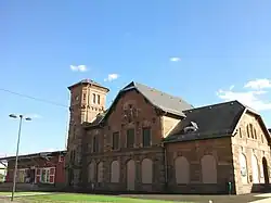 Construit en pierre de taille dans un style typique de la Direction des chemins de fer d'Alsace-Lorraine (EL), le second bâtiment s'articule autour d'un volume de cinq travées, dont trois surmontées par un haut pignon transversal avec, à sa gauche une aile basse de deux travées se terminant par une demi-croupe et à sa droite la tour-horloge, dont le toit était originellement plus haut et plus pentu[10]. Directement accolée au bâtiment, la halle est réalisée en bois ; un réparateur de vélos y est installé[11].