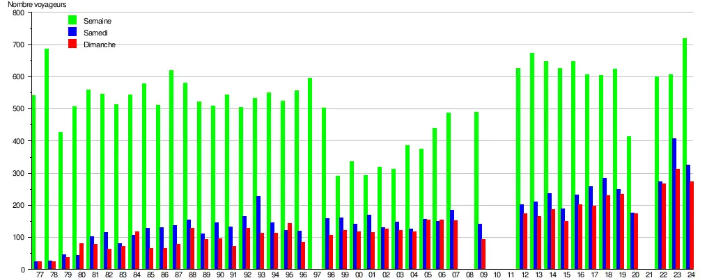 Ce graphique et tableau montre le nombre de voyageurs embarquant en moyenne durant la semaine, le samedi et le dimanche[4].