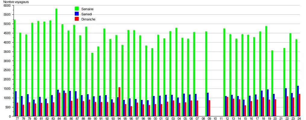 Ce graphique et tableau montre le nombre de voyageurs embarquant en moyenne durant la semaine, le samedi et le dimanche[11].