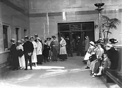La salle d’attente a des plafonds hauts de 13.4 m avec les luminaires originaux qui ont été construits pour reproduire les roues des trains. Les tiroirs des guichets de billets d'origine sont intacts parmi les bouteilles de vin [1].