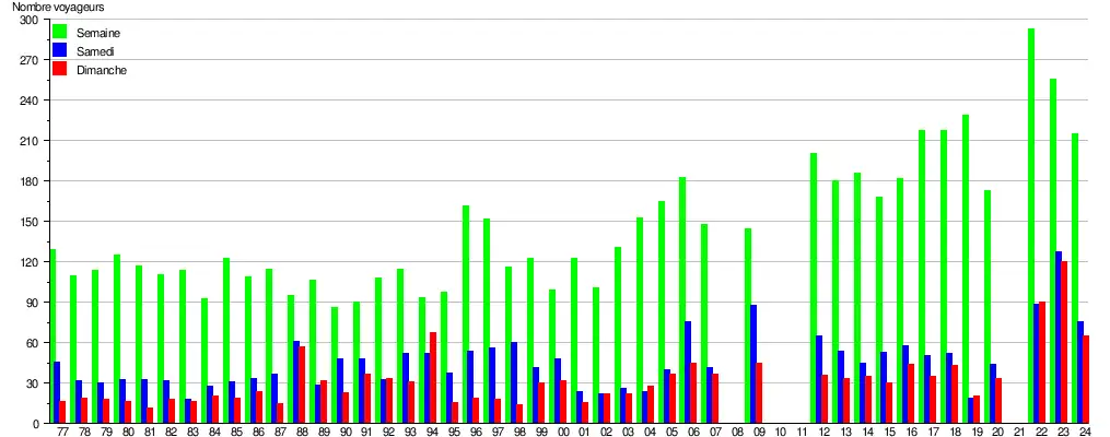 Ce graphique et tableau montre le nombre de voyageurs embarquant en moyenne durant la semaine, le samedi et le dimanche[4].