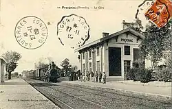 Les voies et quais de la halte avec l'abri et l'ancien bâtiment voyageurs « Midi ». | |