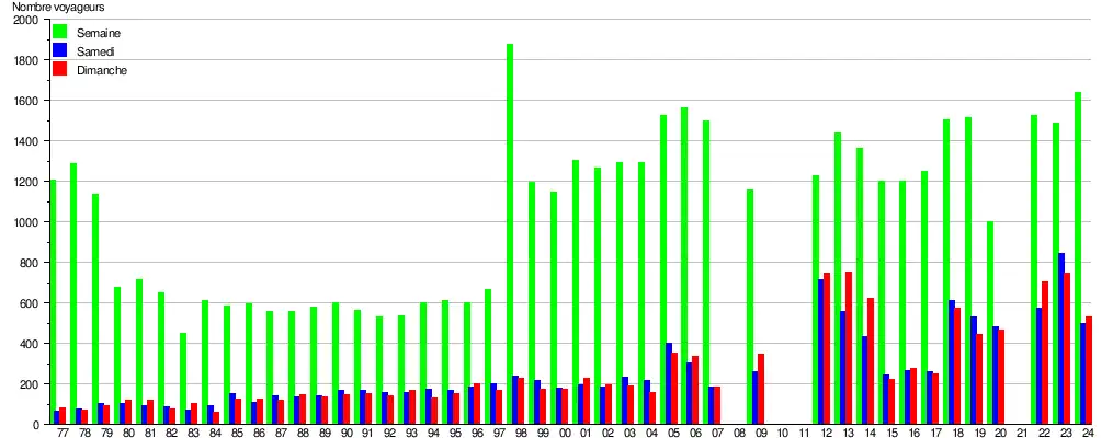 Ce graphique et tableau montre le nombre de voyageurs embarquant en moyenne durant la semaine, le samedi et le dimanche[10].