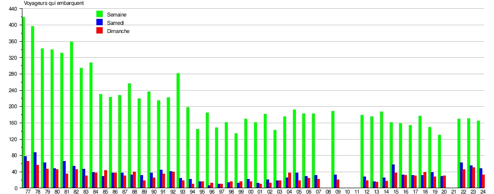 Le graphique et le tableau montrent le nombre de passagers qui en moyenne embarquent durant la semaine, le samedi et le dimanche[10].