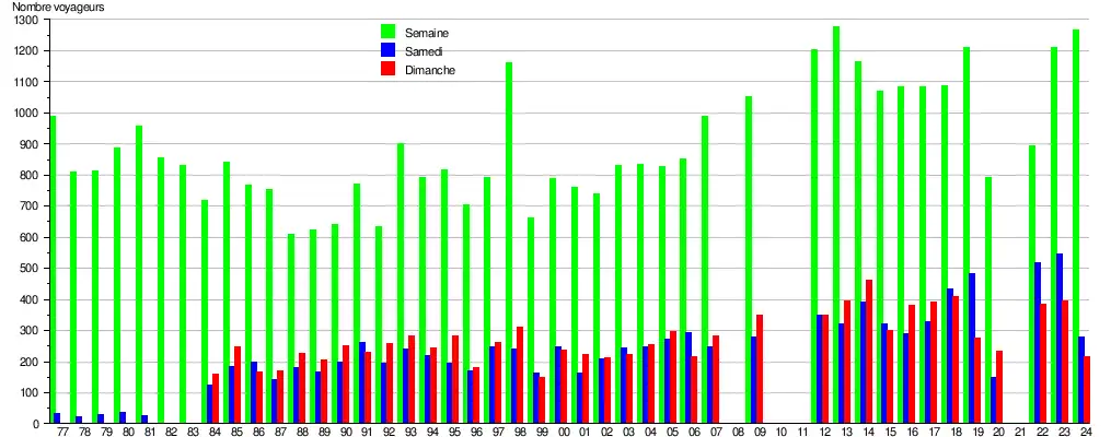 Ce graphique et tableau montre le nombre de voyageurs embarquant en moyenne durant la semaine, le samedi et le dimanche[17].