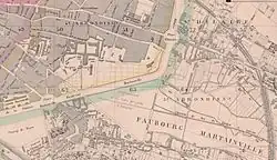 La compagnie du Nord soumet un projet d'implantation de ses installations, qui comprend notamment un embarcadère voyageurs et une gare marchandises, à l'enquête administrative. Le site est compris entre le boulevard Martainville, la rue Préfontaine, la route impériale n°30, de Rouen à la Capelle, et le chemin de fer de Paris au Havre. Il est situé dans une prairie basse que bordent à l'ouest le Robec, à l'est les deux Aubettes, et qu'arrosent de nombreuses déviations de ces rivières et des ruisseaux[3].