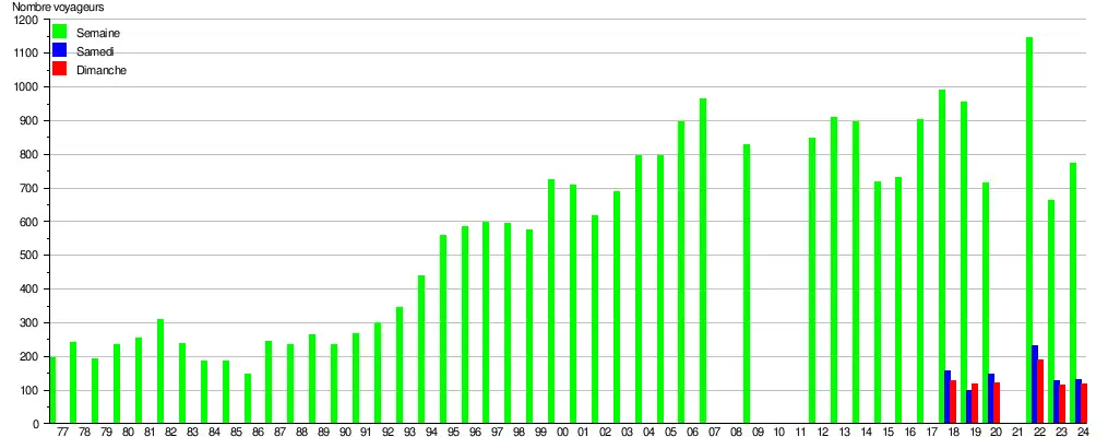 Ce graphique et tableau montre le nombre de voyageurs embarquant en moyenne durant la semaine, le samedi et le dimanche[8].