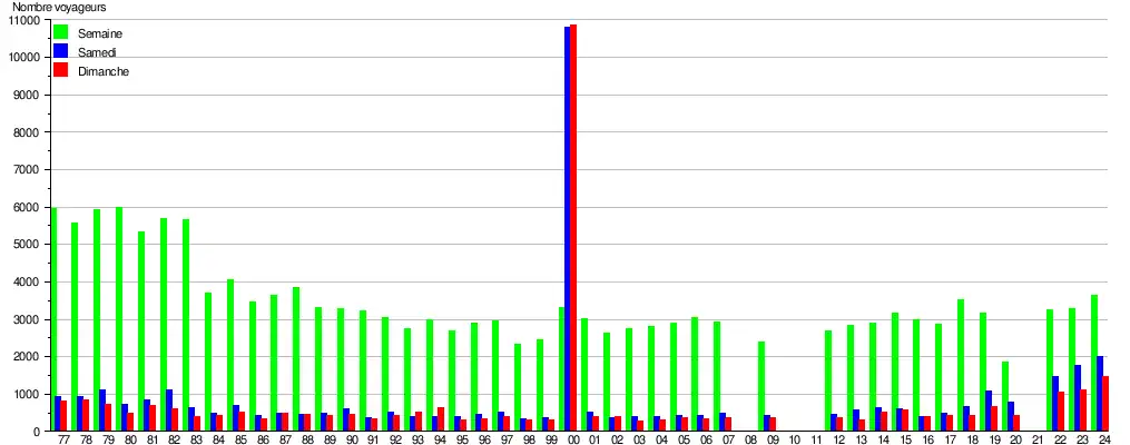 Ce graphique et tableau montre le nombre de voyageurs embarquant en moyenne durant la semaine, le samedi et le dimanche[22].
