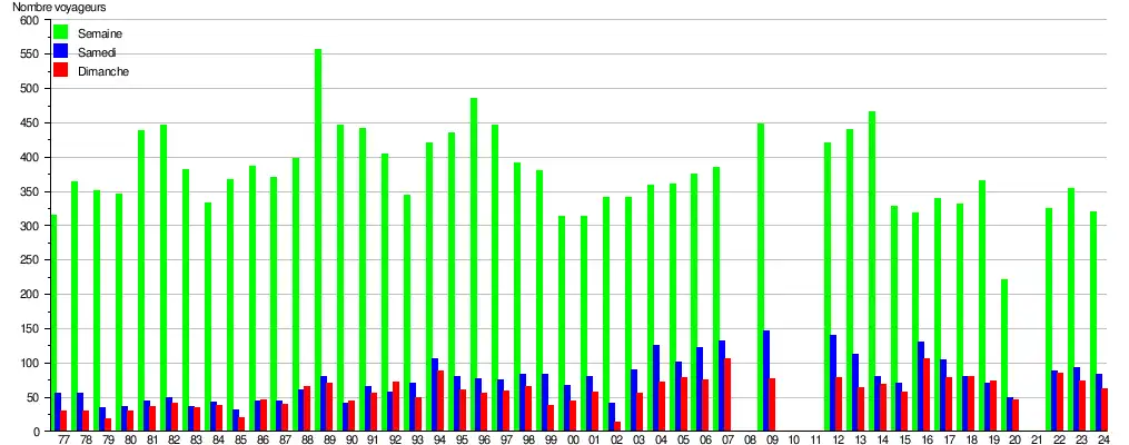 Ce graphique et tableau montre le nombre de voyageurs embarquant en moyenne durant la semaine, le samedi et le dimanche[6].