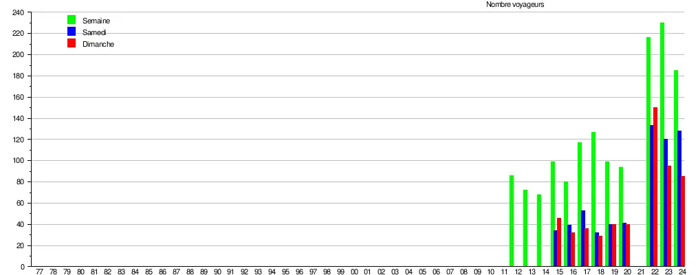 Ce graphique et tableau montre le nombre de voyageurs embarquant en moyenne durant la semaine, le samedi et le dimanche[6].