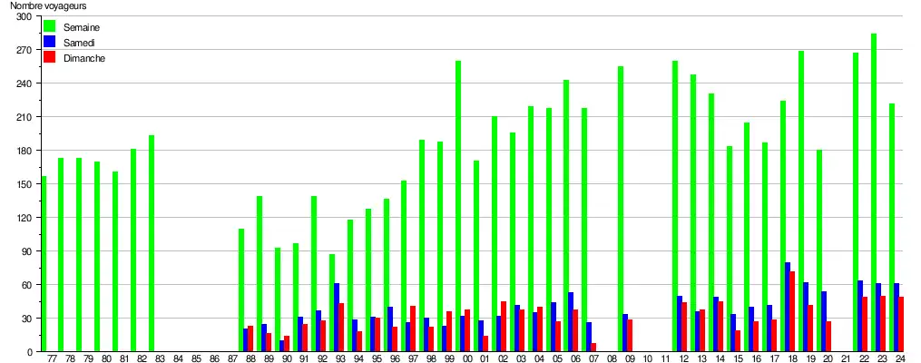 Ce graphique et tableau montre le nombre de voyageurs embarquant en moyenne durant la semaine, le samedi et le dimanche[7].