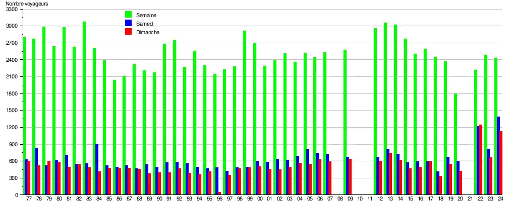 Ce graphique et tableau montre le nombre de voyageurs embarquant en moyenne durant la semaine, le samedi et le dimanche[14].