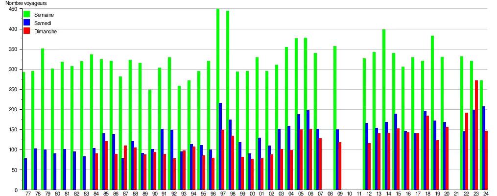 Ce graphique et tableau montre le nombre de voyageurs embarquant en moyenne durant la semaine, le samedi et le dimanche[5].