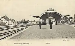 La voie ferrée est déplacée vers le sud de Neudorf au début du XXe siècle. La gare aux marchandises de Neudorf (« Güterbahnhof Neudorf » en allemand) est construite en 1905 dans le secteur du Heyritz[2]. La gare voyageurs, avec son bâtiment de style néo-renaissance, est édifiée la même année par la Direction générale impériale des chemins de fer d'Alsace-Lorraine (EL).