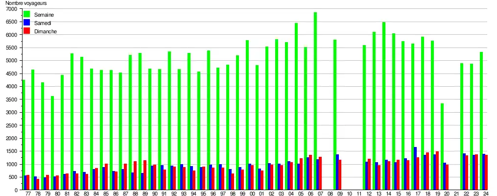 Ce graphique et tableau montre le nombre de voyageurs embarquant en moyenne durant la semaine, le samedi et le dimanche[10].