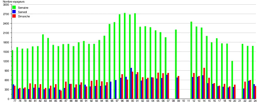 Ce graphique et tableau montre le nombre de voyageurs embarquant en moyenne durant la semaine, le samedi et le dimanche[9].