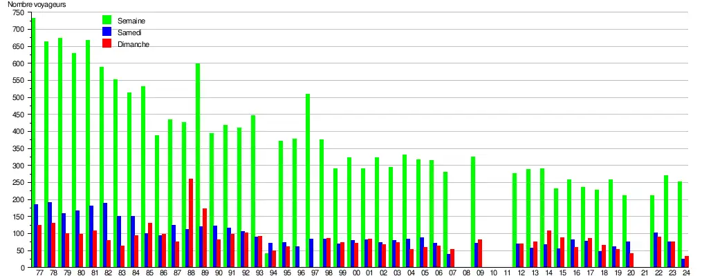 Ce graphique et tableau montre le nombre de voyageurs embarquant en moyenne durant la semaine, le samedi et le dimanche[14].