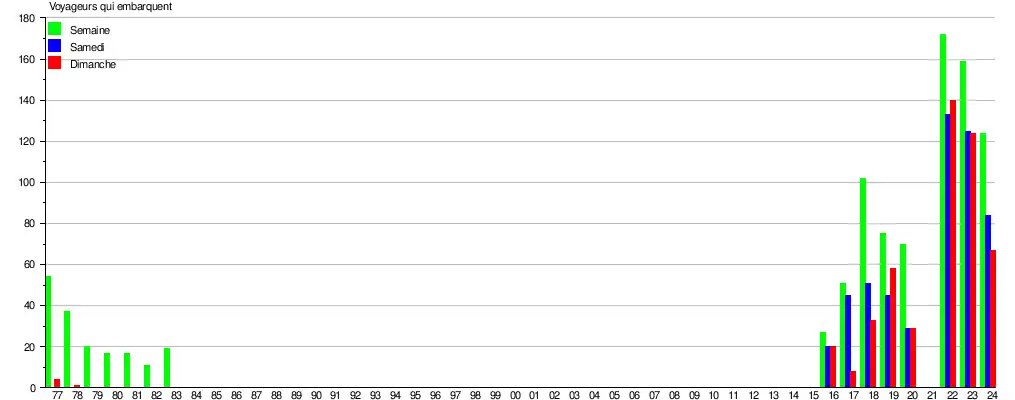 Le graphique et le tableau montrent le nombre de passagers qui en moyenne embarquent durant la semaine, le samedi et le dimanche[4].
