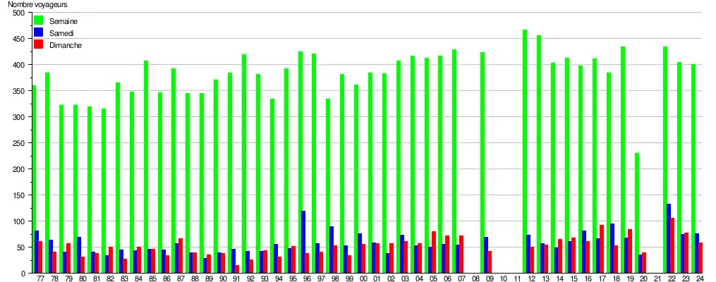 Ce graphique et tableau montre le nombre de voyageurs embarquant en moyenne durant la semaine, le samedi et le dimanche[11].