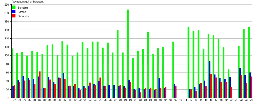Le graphique et le tableau montrent le nombre de passagers qui en moyenne embarquent durant la semaine, le samedi et le dimanche[4].