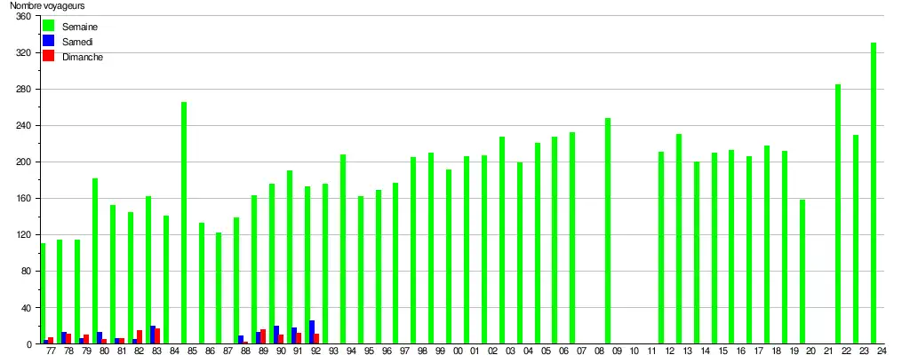 Ce graphique et tableau montre le nombre de voyageurs embarquant en moyenne durant la semaine, le samedi et le dimanche[10].