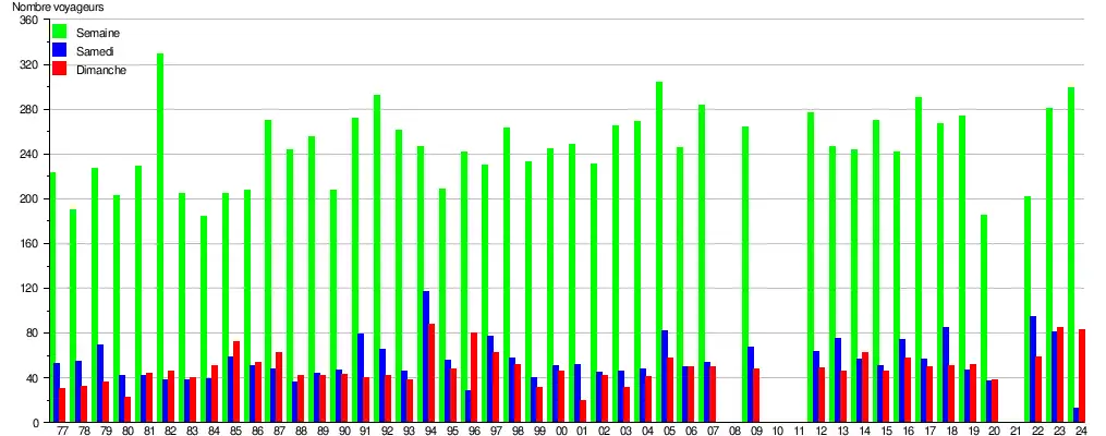Ce graphique et tableau montre le nombre de voyageurs embarquant en moyenne durant la semaine, le samedi et le dimanche[10].