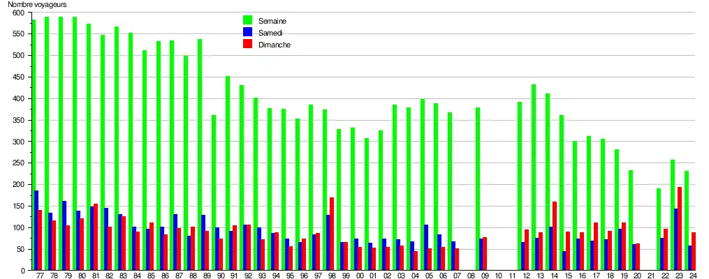Ce graphique et tableau montre le nombre de voyageurs embarquant en moyenne durant la semaine, le samedi et le dimanche[9].