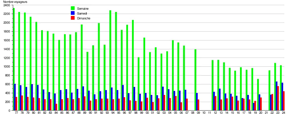 Ce graphique et tableau montre le nombre de voyageurs embarquant en moyenne durant la semaine, le samedi et le dimanche[5].