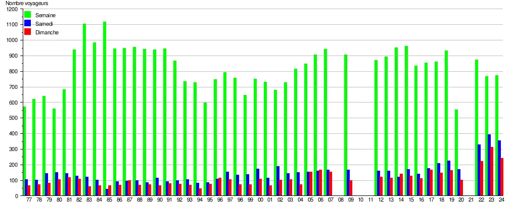 Ce graphique et tableau montre le nombre de voyageurs embarquant en moyenne durant la semaine, le samedi et le dimanche[3].
