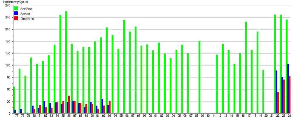 Ce graphique et tableau montre le nombre de voyageurs embarquant en moyenne durant la semaine, le samedi et le dimanche[12].