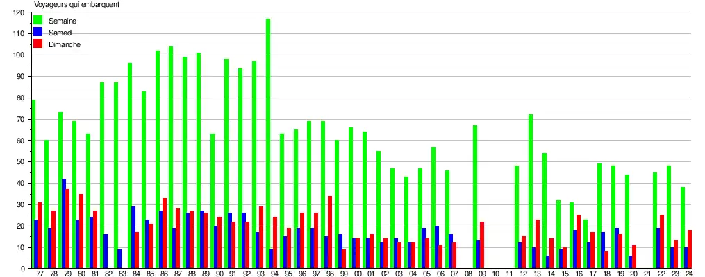 Le graphique et le tableau montrent le nombre de passagers qui en moyenne embarquent durant la semaine, le samedi et le dimanche[7].