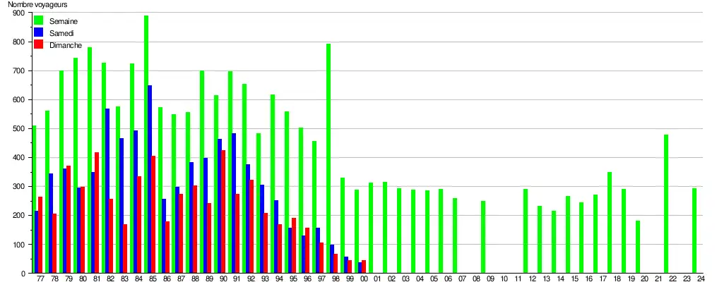 Ce graphique et tableau montre le nombre de voyageurs embarquant en moyenne durant la semaine, le samedi et le dimanche[5].