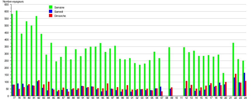 Ce graphique et tableau montre le nombre de voyageurs embarquant en moyenne durant la semaine, le samedi et le dimanche[8].