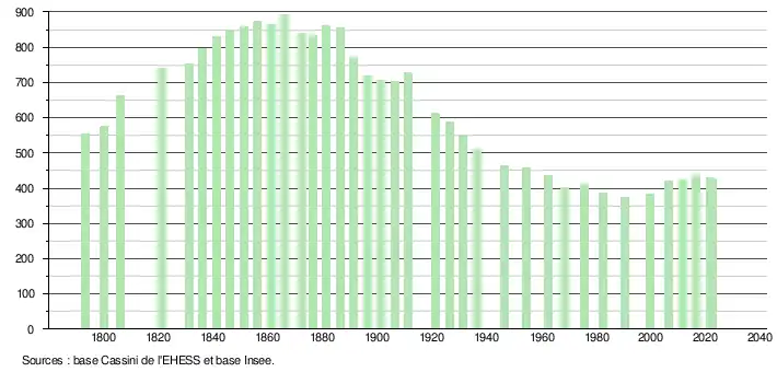 | L'évolution du nombre d'habitants est connue à travers les recensements de la population effectués dans la commune depuis 1793. Pour les communes de moins de 10 000 habitants, une enquête de recensement portant sur toute la population est réalisée tous les cinq ans, les populations de référence des années intermédiaires étant quant à elles estimées par interpolation ou extrapolation[21]. Pour la commune, le premier recensement exhaustif entrant dans le cadre du nouveau dispositif a été réalisé en 2006[22]. En 2022, la commune comptait 426 habitants[Note 2], en évolution de −2,07 % par rapport à 2016 (Landes : +5,78 %, France hors Mayotte : +2,11 %). |
