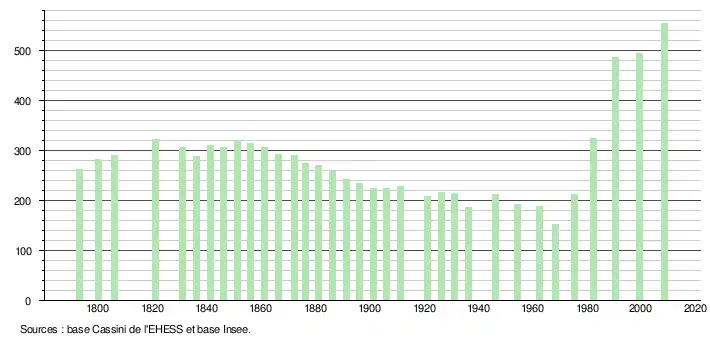 L'évolution du nombre d'habitants est connue à travers les recensements de la population effectués dans la commune depuis 1793. À partir du , les populations légales des communes sont publiées annuellement dans le cadre d'un recensement qui repose désormais sur une collecte d'information annuelle, concernant successivement tous les territoires communaux au cours d'une période de cinq ans. Pour les communes de moins de 10 000 habitants, une enquête de recensement portant sur toute la population est réalisée tous les cinq ans, les populations légales des années intermédiaires étant quant à elles estimées par interpolation ou extrapolation[4]. Pour la commune, le premier recensement exhaustif entrant dans le cadre du nouveau dispositif a été réalisé en 2008[5],[Note 1].