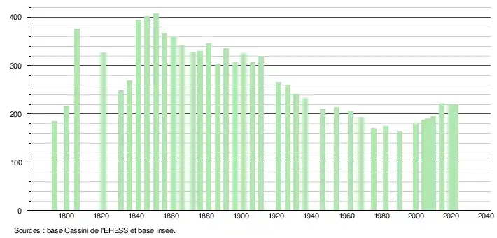 L'évolution du nombre d'habitants est connue à travers les recensements de la population effectués dans la commune depuis 1793. Pour les communes de moins de 10 000 habitants, une enquête de recensement portant sur toute la population est réalisée tous les cinq ans, les populations de référence des années intermédiaires étant quant à elles estimées par interpolation ou extrapolation[39]. Pour la commune, le premier recensement exhaustif entrant dans le cadre du nouveau dispositif a été réalisé en 2004[40].