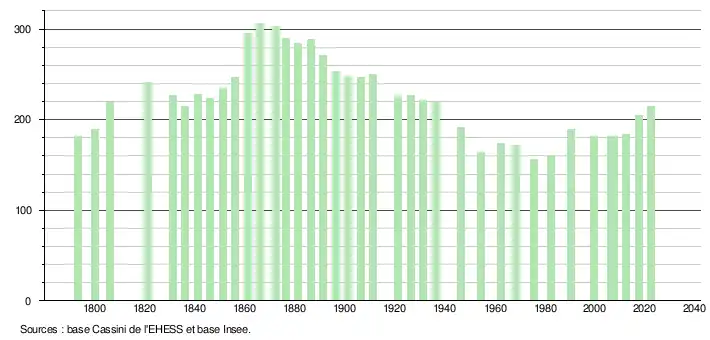 | L'évolution du nombre d'habitants est connue à travers les recensements de la population effectués dans la commune depuis 1793. Pour les communes de moins de 10 000 habitants, une enquête de recensement portant sur toute la population est réalisée tous les cinq ans, les populations de référence des années intermédiaires étant quant à elles estimées par interpolation ou extrapolation[25]. Pour la commune, le premier recensement exhaustif entrant dans le cadre du nouveau dispositif a été réalisé en 2007[26]. En 2022, la commune comptait 215 habitants[Note 2], en évolution de +7,5 % par rapport à 2016 (Landes : +5,78 %, France hors Mayotte : +2,11 %). |